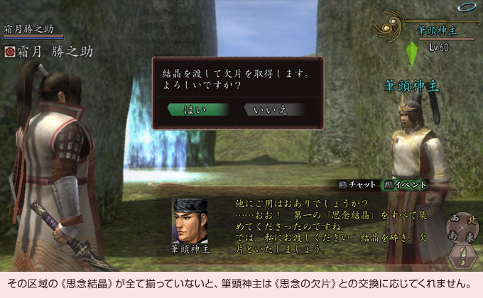 ボス徒党を撃破すると《思念結晶》(しねんけっしょう)と《思念の欠片》が手に入ります。《思念結晶》はボス徒党ごとに違うものがもらえます。その階層にいる全てのボス徒党から手に入る《思念結晶》を揃え、筆頭神主に渡すと、それらの結晶を砕いて大量の《思念の欠片》に換えてくれます。