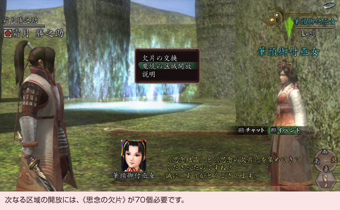 忘却の魔境で集めた《思念の欠片》は、“筆頭御付巫女”(ひっとうおつきみこ)にて、報酬と交換したり、魔境の次なる区域の開放に使用できます。