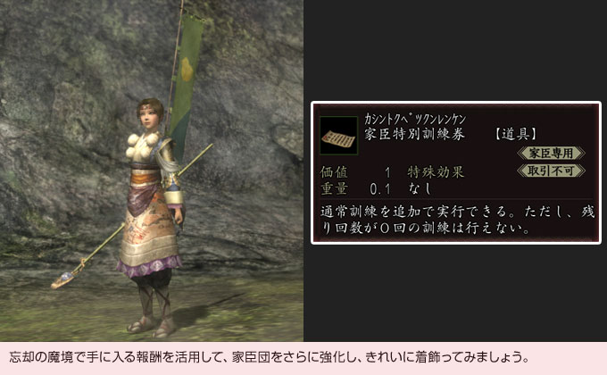 報酬としては、家臣を着飾れるアイテム(化粧、装飾品、立物など)のほか、通常訓練を追加で実行できる《家臣特別訓練券》が手に入ります。