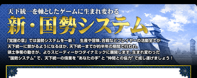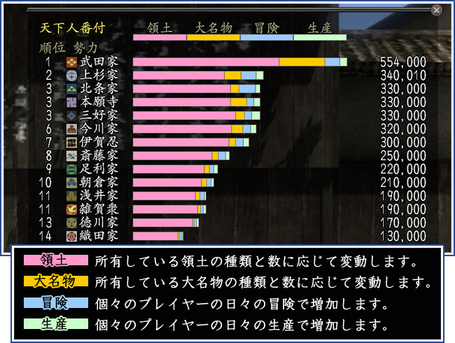 これまで勢力の順位は、“領土”の合計値のみが“天下人得点”に反映され、その数値で決定されていました。「覚醒の章」からは領土のほか、新たに“大名物”と“冒険”、“生産”という3つの要素が、天下人得点に反映されるようになります。これにより、プレイヤーの活動のほぼ全てが、勢力への貢献へと繋がっていきます。