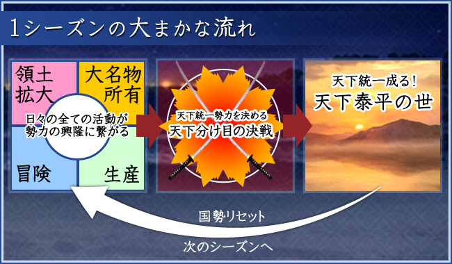 「天下分け目の決戦」により、天下統一が成し遂げられた後は国勢がリセットされ、次のシーズンが始まります。