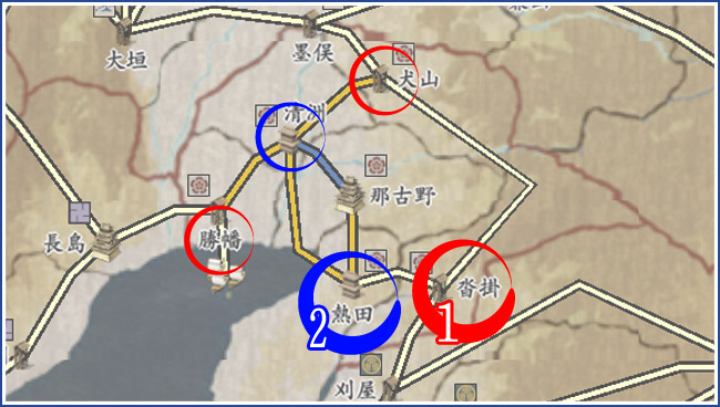1. 外郭拠点の沓掛(くつかけ)を攻めて大勝すれば、同じ外郭拠点の犬山(いぬやま)か勝幡(しょばた)が同時に手に入る。