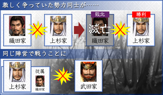 滅亡勢力によるお家再興戦を廃止します。滅亡すると、天下統一まで滅ぼした勢力に従属した状態となります。
