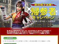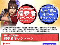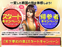 「天下夢幻の章」のサービスインを記念して、新規プレイヤーを対象とした「スタートキャンペーン」と、復帰プレイヤーを対象とした「帰参者キャンペーン」を同時に開催します。この機会に「天下夢幻の章」で変わる“戦国の世”を存分にお楽しみください。