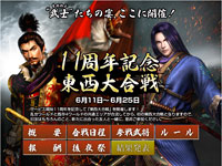 サービス開始11周年記念となる「東西大合戦」は、明智光秀(あけちみつひで)率いる東軍と、織田信長(おだのぶなが)率いる西軍が雌雄を決します。他特化の技能を使える“万能武器”と能力強化アイテム《武神の霊薬》を活用して、一大決戦を戦い抜きましょう。
