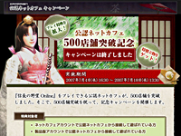 『信長の野望 Online』をプレイできる公認ネットカフェが500店舗を突破しました。それを記念してキャンペーンを実施します。期間中、公認ネットカフェからプレイすると、プレイヤーキャラクターの成長が促進され、特製アイテムもプレゼントされます。