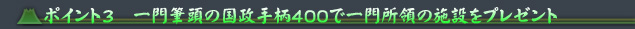 一門筆頭の国政手柄が400を超えた状態でNPC“松島の旅人”に話し掛けると、一門所領(いちもんしょりょう)の施設の中から、任意で1つを獲得できます。