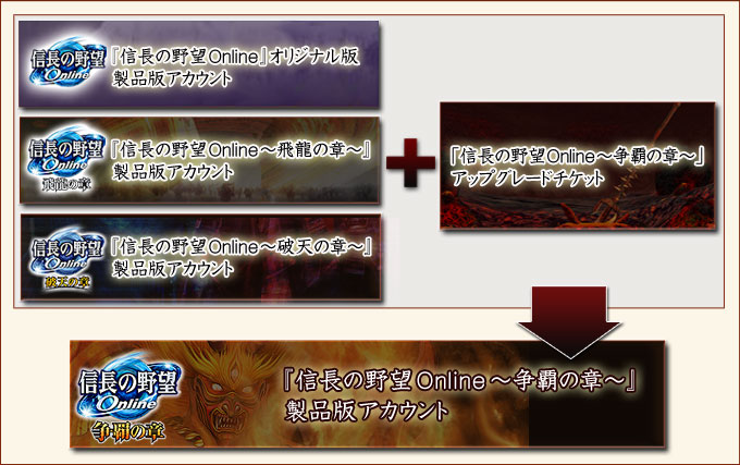『信長の野望 Online』オリジナル版もしくは「飛龍の章」、「破天の章」の製品版アカウントをお持ちの方が、「争覇の章」へ移行される場合は、オンラインから「信長の野望 Online 〜争覇の章〜」アップグレードチケット(先行発売) (2,940円[税込])をご購入ください。これで「争覇の章」で追加される新要素が楽しめるようになります。