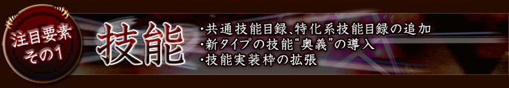 一定時間ごとに使用できる強力な新技能“奥義”が導入されます。“奥義”は新たに追加される特化系技能目録の3〜4つ目に入っており、その修得方法は通常の技能と同様です。
