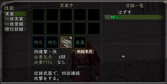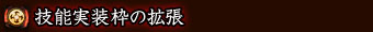 共通技能目録と特化系技能目録の追加、“奥義”の導入に伴い、技能の実装枠を拡張します。拡張されるのは、特化専用枠として3つ、奥義専用枠として1つの計4枠です。特化専用枠は潜在能力で獲得でき、奥義専用枠は新しい特化系技能目録を使用した時に自動的に獲得できます。