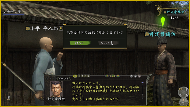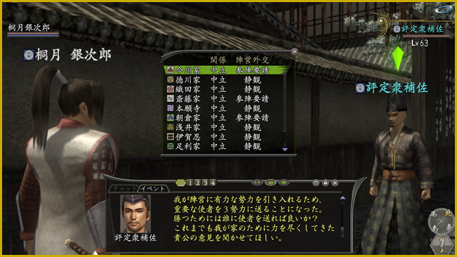 勢力に所属しているプレイヤーキャラクターは、自勢力のNPC“評定衆補佐”より参加できます。浪人のプレイヤーキャラクターは、加担したい勢力のNPC“評定衆補佐”より参加できます。