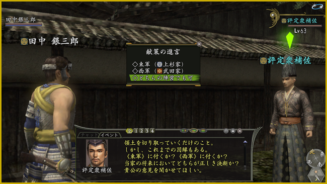 盟主以外の12勢力は、それぞれ東軍と西軍のどちらに味方するか(またはどちらでもよいか)、の献策を行います。