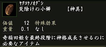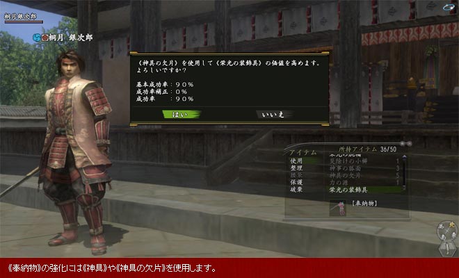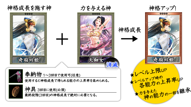 | ¿À¡¹¤Ë¤ÏºÇÂç¤Ç3²ó¤Þ¤Ç¿À³ÊÀ®Ä¹¤ò»Ü¤»¤Þ¤¹¡£ ºÇ½ªÃʳ¬¤Ç¤¢¤ë3²óÌܤǤϡ¢ÎϤòÍ¿¤¨¤ë¿À¤À¤±¤Ç¤Ê¤¯¡¢¡Ô¿À¶ñ¡Õ¤È¤¤¤¦ÆÃÊ̤ʥ¢¥¤¥Æ¥à¤¬É¬ÍפǤ¹¡£É¬ÍפȤʤë¡Ô¿À¶ñ¡Õ¤Ï¡¢¿À³ÊÀ®Ä¹¤µ¤»¤ë¿À¤´¤È¤Ë°Û¤Ê¤ê¤Þ¤¹¡£Î㤨¤Ð¡¢´ñ°ðÅÄɱ¤òºÇ½ªÃʳ¬¤Ë¿À³ÊÀ®Ä¹¤µ¤»¤ë¾ì¹ç¤Ï¡¢¡ÔºÒ½ü¤±¤Î¾®¶û¡Õ¤È¤¤¤¦¡Ô¿À¶ñ¡Õ¤¬É¬ÍפǤ¹¡£ ¡Ô¿À¶ñ¡Õ¤Ï¥¢¥«¥¦¥ó¥È¤´¤È¤Ë¡¢¾ë²¼Ä®¤Ë¤¤¤ëNPC¡È¾ë¼çÊ亴¡É¤«¤é1Æü1¸Ä¥é¥ó¥À¥à¤Ç¤â¤é¤¨¤Þ¤¹¡£ |
