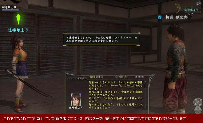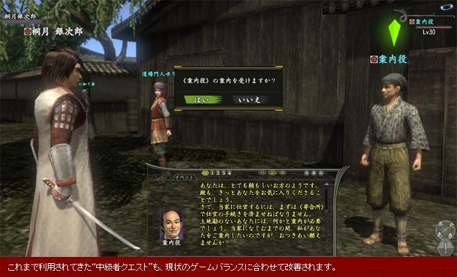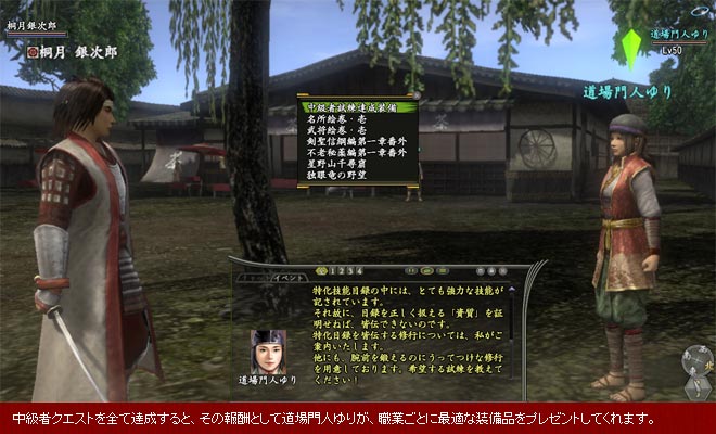 これまで、案内役からもらえる“伝助の見聞録”を通して、続・中級者クエストが進行する仕組みでしたが、道場門人ゆりから依頼を受けるようになります。また、続・中級者クエストに依頼が追加され、これを達成することで特化技能目録五、六、七までを皆伝できるようになります。