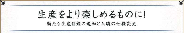 生産をより親しみやすく、また楽しいものとするため、新たな生産目録を追加すると共に、現在、生産の敷居を高くしている“入魂”の仕様を変更します。