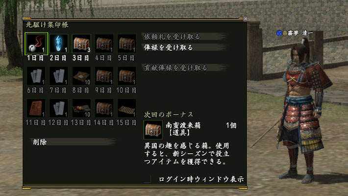 期間中、「もののふ集印帳」と「追加集印帳」のログイン時に押されるスタンプが2倍になり、毎日アイテムを2日分受け取れるようになります。