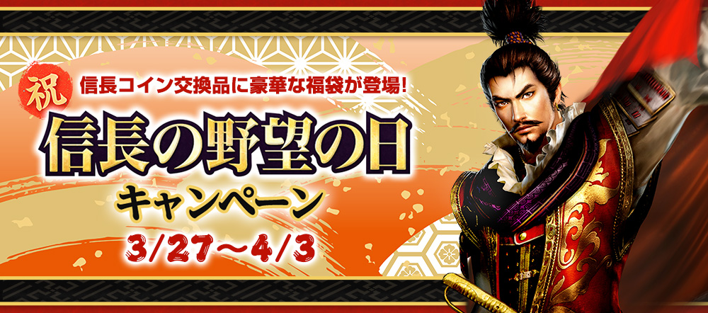 期間中、3月30日の「信長の野望の日」を記念した豪華な《野望福袋2019》が「信長コイン」の交換品に登場します。
