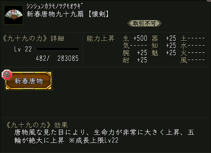 ●九十九の源・極 ×30 ●新春唐物九十九扇×1 効果:九十九の力「新春唐物」が付いた武器。
