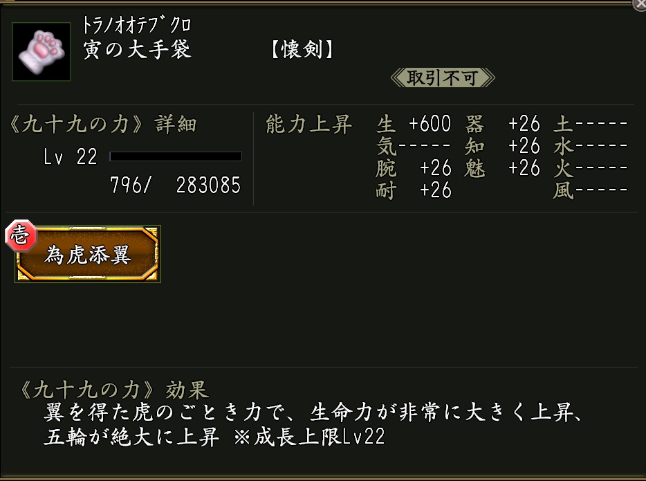 使用すると、下記アイテムを取り出せる。 ●三継九十九珠・極×1 効果:九十九の力の合成時に、素材武器の九十九の力が三つ必ず受継がれ、八つの力が発現する。 ●九十九の源・極×30 NEW ●寅の大手袋×1 効果:九十九の力「為虎添翼(いこてんよく)」が付いた武器。