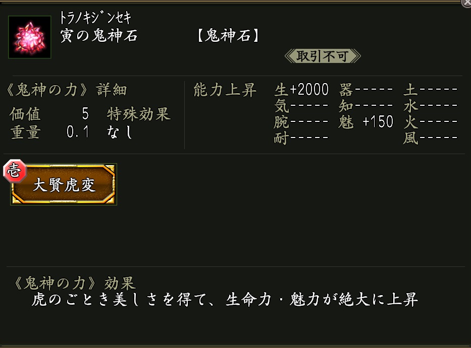 NEW ●寅の鬼神石×1 効果:鬼神の力「大賢虎変(たいけんこへん)」が付いた鬼神石。