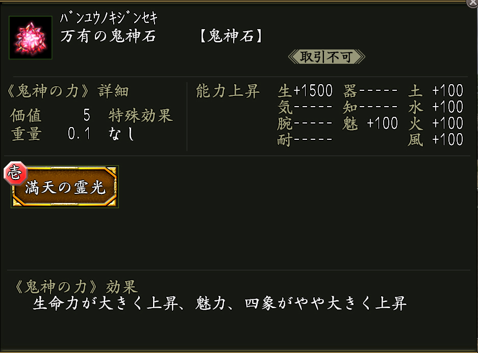 NEW ●万有の鬼神石×1 効果:鬼神の力「満天の霊光(まんてんのれいこう)」が付いた鬼神石。