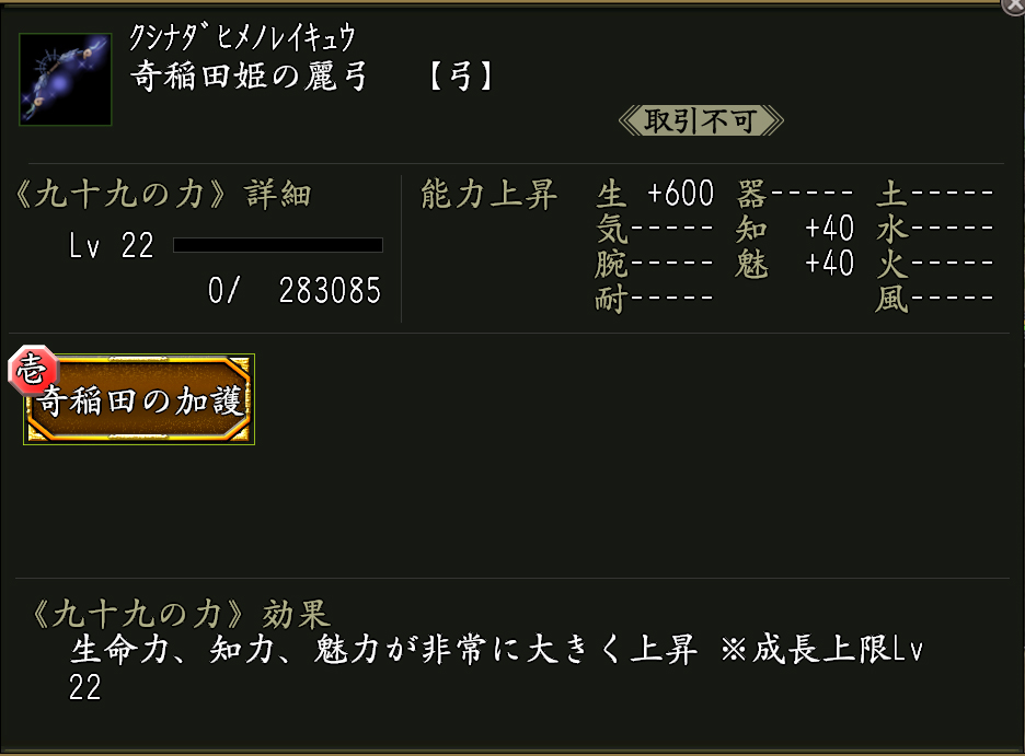 NEW ●奇稲田姫の麗弓×1 効果:九十九の力「奇稲田の加護(くしなだのかご)」が付いた武器。