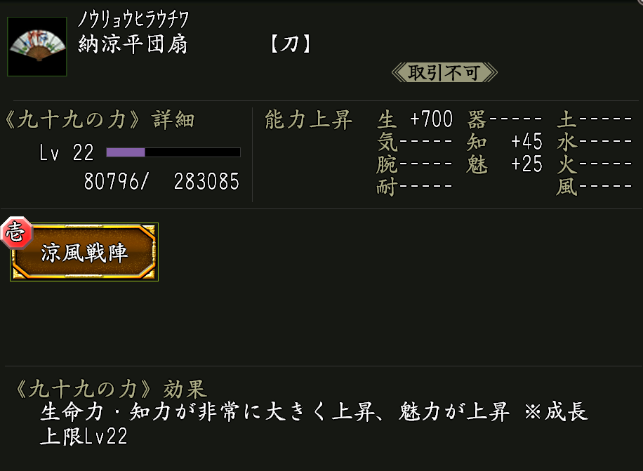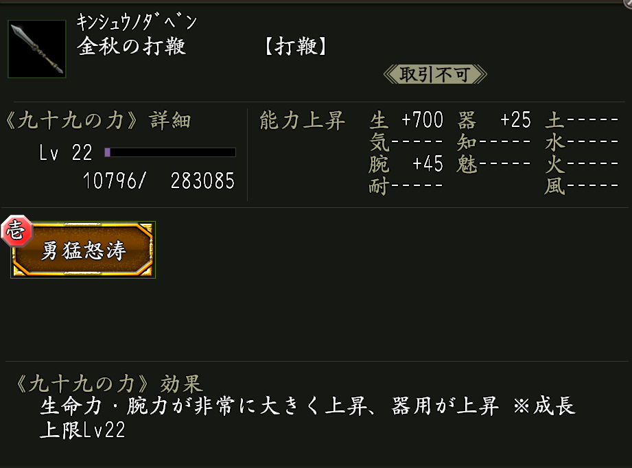 | 生命上昇率向上Lv.2 | 家臣闘練で修練内容に配置された時に、生命力の上昇割合を上げる。 | ||||
