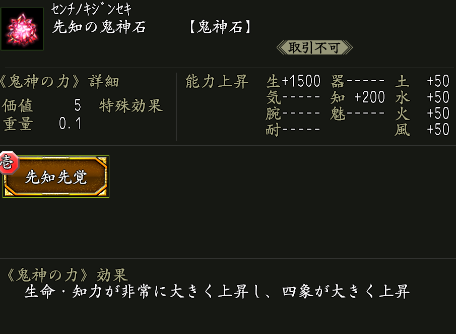 使用すると、下記アイテムを取り出せる。 NEW ●先知の鬼神石×1 効果:鬼神の力「先知先覚」が付いた鬼神石。 ●双継鬼神珠・壱×1 ●虚空の鬼神石×1 ●鬼神浄化石×1