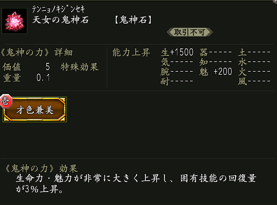 使用すると、下記アイテムを取り出せる。 NEW ●天女の鬼神石×1 効果:鬼神の力「才色兼美」が付いた鬼神石。 ●双継鬼神珠・壱×1 ●虚空の鬼神石×1 ●鬼神浄化石×1