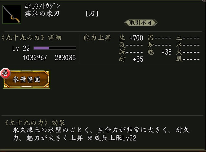使用すると、以下のアイテムが獲得できます。 ●霧氷の凍刃 効果:九十九の力「氷壁堅固」が付いた武器。