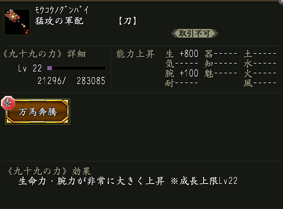 ・《猛攻の軍配》 効果:九十九の力「万馬奔騰(ばんばほんとう)」が付いた武器。