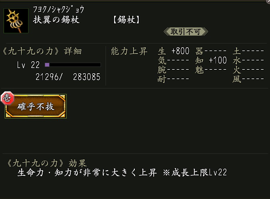 ・《扶翼の錫杖》 効果:九十九の力「確乎不抜(かっこふばつ)」が付いた武器。