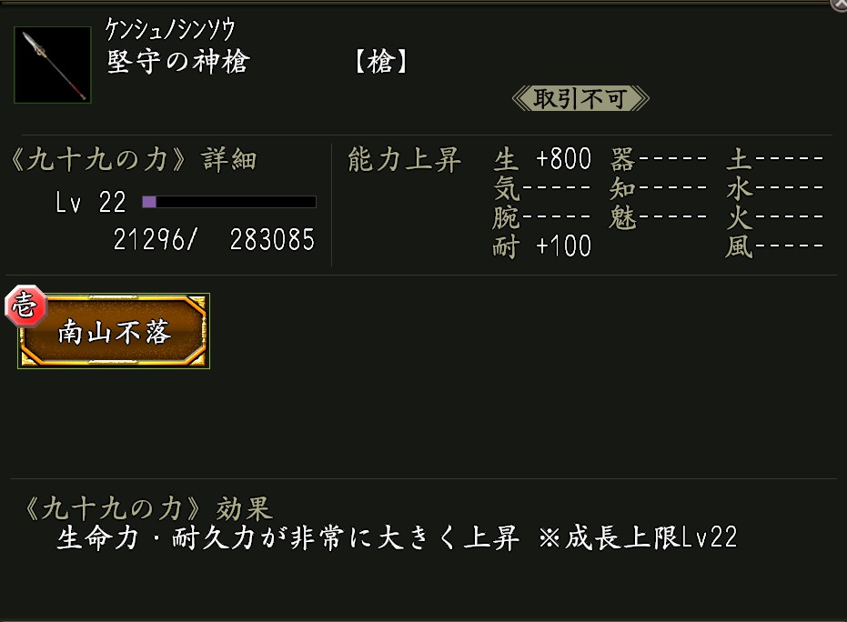 ・《堅守の神槍》 効果:九十九の力「南山不落(なんざんふらく)」が付いた武器。