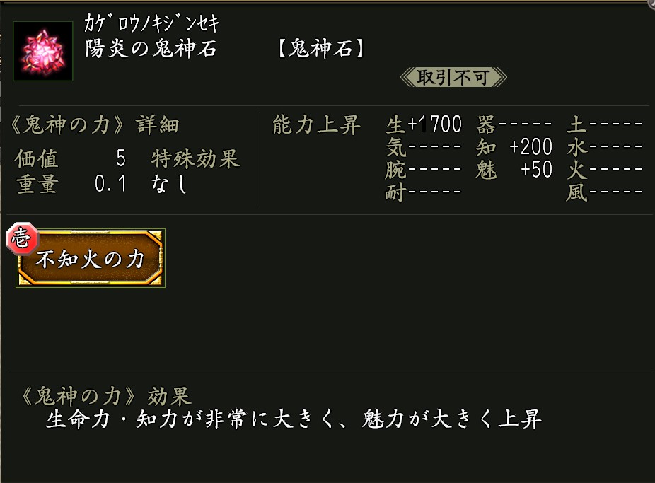NEW ●陽炎の鬼神石×1 効果:鬼神の力「不知火の力(しらぬいのちから)」が付いた鬼神石。