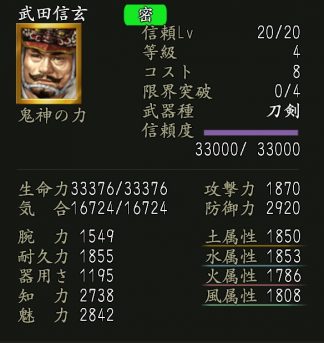 | 知力修練上昇Lv.5 | 家臣闘練で知力上昇系の修練に配置された時に、鍛錬効果を上げる。 | ||||