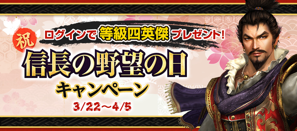 《英傑の招喚鈴・な》の英傑に加え、ピックアップされた「武田信玄・野望」「上杉謙信・野望」が登場する御縁鈴。 2023年4月12日(水)9:29までに使用すると、特典ポイントを100ポイント獲得できます。 限界突破の仕様は「英傑の招喚鈴」と同様です。 特典ポイントは「野望の御縁鈴・な」1つにつき100ポイント、計2,000ポイント獲得できます。