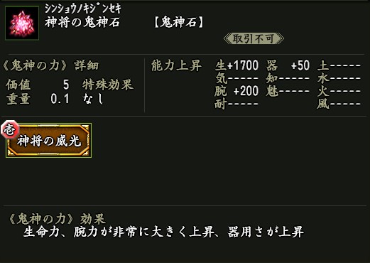 使用すると、下記アイテムを取り出せる。 ●神将の鬼神石×1 効果:鬼神の力「神将の威光」が付いた鬼神石。 ●双継鬼神珠・壱×1 ●虚空の鬼神石×1 ●鬼神浄化石×1