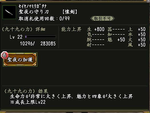 九十九の力合成時に使用すると、取消札・九十九珠を消費した後に一度だけ合成結果を取り消すことができる。
