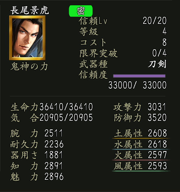 | 魅力上昇Lv.3 | 家臣闘練で修練内容に配置された時に、魅力の上昇量を上げる。 | |||||