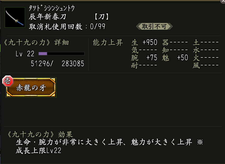 九十九の力「辰年盛運(たつどしせいうん)」が付いた武器。
