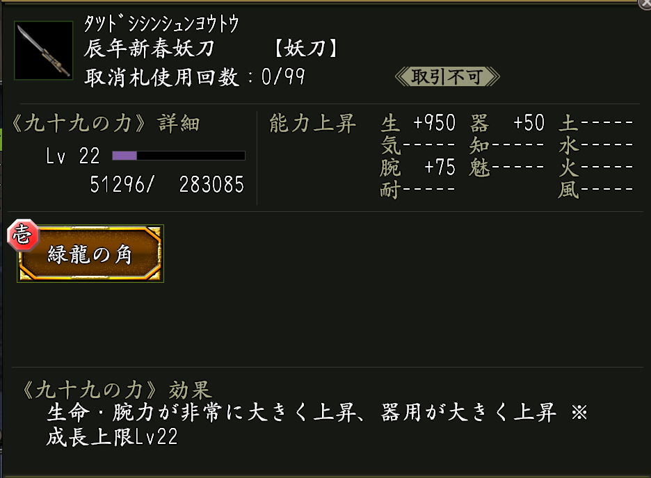 ・辰年新春妖刀×1 効果:九十九の力「緑龍の角(りょくりゅうのつの)」が付いた武器。