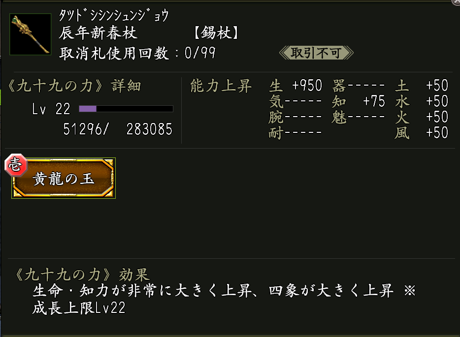 ・辰年新春杖×1 効果:九十九の力「黄龍の玉(こうりゅうのたま)」が付いた武器。
