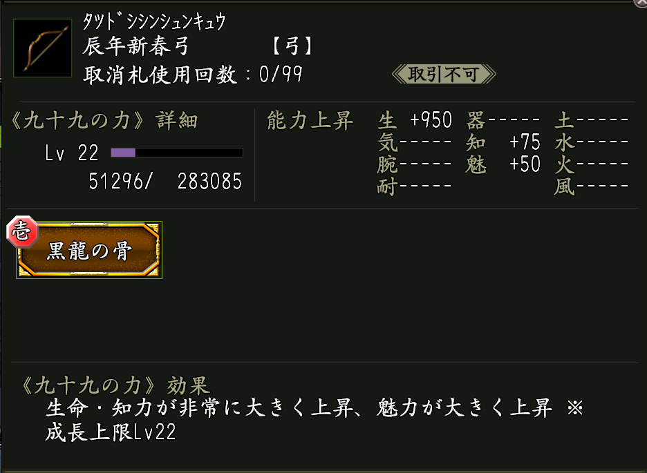 ・辰年新春弓×1 効果:九十九の力「黒龍の骨(こくりゅうのほね)」が付いた武器。
