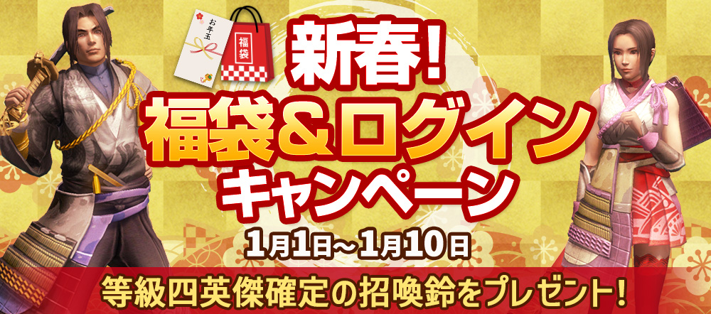 期間中ログインすると、新年をお祝いして「英傑の招喚鈴・ゐ」までの等級4英傑の中からランダムで1人が仲間になる「等級四招喚鈴・ゐ」1個をプレゼントします。