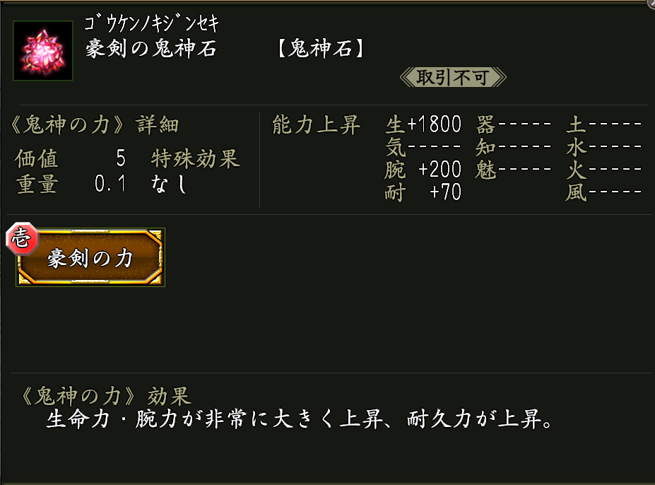 NEW ●豪剣の鬼神石×1 効果:鬼神の力「豪剣の力(ごうけんのちから)」が付いた鬼神石。