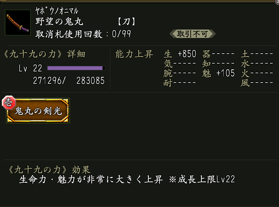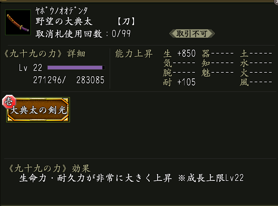 ![]() NEW ・《野望の童子切》 効果:九十九の力「童子切の剣光(どうじぎりのけんこう)」が付いた武器。