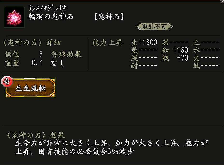 鬼神の力「生生流転」(せいせいるてん)が付いた鬼神石。