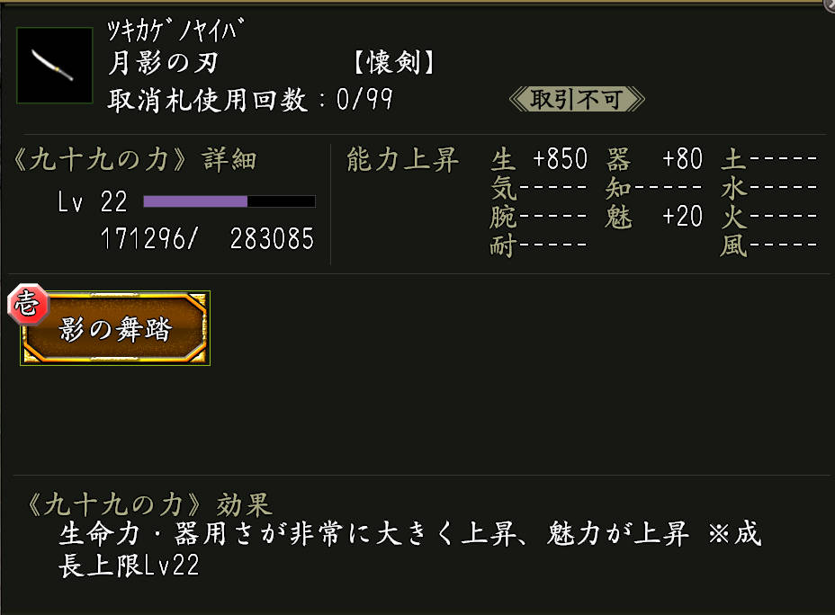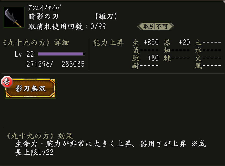 九十九の力「影の舞踏(かげのぶとう)」(黄金枠)がついた武器。