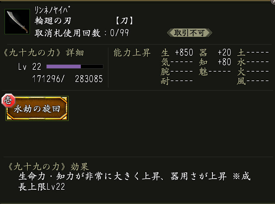 九十九の力「永劫の旋回(えいごうのせんかい)」(黄金枠)がついた武器。