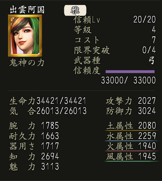 | 魅力上昇率向上Lv.3 | 家臣闘練で修練内容に配置された時に、魅力の上昇割合を上げる。 | |||||